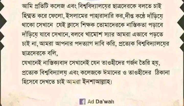 Jahangir Alom: স্যার, আসসালামু আলাইকুম। আমি মনে করি, ছবিতে যে নাস্তিক্যবাদ পড়ানোর বিরোধিতা করা হয়েছে তা আপনার পড়ানো নাস্তিক্যবাদ না। সম্ভবত তার ইচ্ছে হল নাস্তিক্যবাদ বা তার বিভিন্ন অনুসঙ্গকে যারা সঠিক হিসেবে তুলে ধরে। ছাত্রদের মিসগাইড করে তাদের বিরোধিতা করা। আপনি যেভাবে নাস্তিকতা পড়ান – ভালোকে বুঝানোর জন্য খারাপকে তুলে ধরা – তাতে কারো কোনো আপত্তি থাকার কথা না। আকিদার কিতাবগুলোতেও তো নাস্তিকতাবাদ, প্রকৃতিবাদকে তুলে ধরে এগুলোর খণ্ডন আছে।